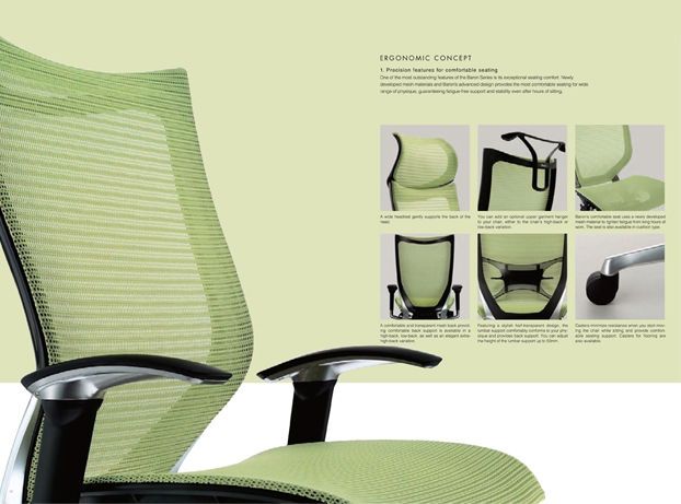 One of the most outstanding features of the Baron Series is its expectional seating comfort. Newly develope mesh materials and Baron's advanced design provides the most comfortable for wide range of physique.