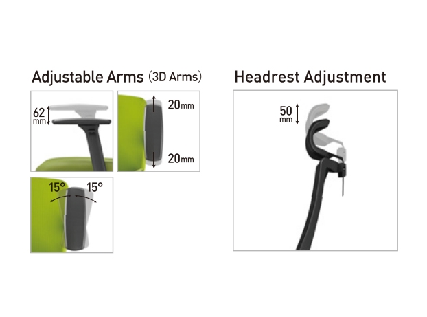 Adjustable Arms (3D Arms). The up and down (1D), angle (2D), back and forth (3D), positioning of the arm pads are adjustable. The respective movable ranges are 62 mm for up and down, 15 degrees for inside, 15 degrees for outside, 40 mm for back and forth.