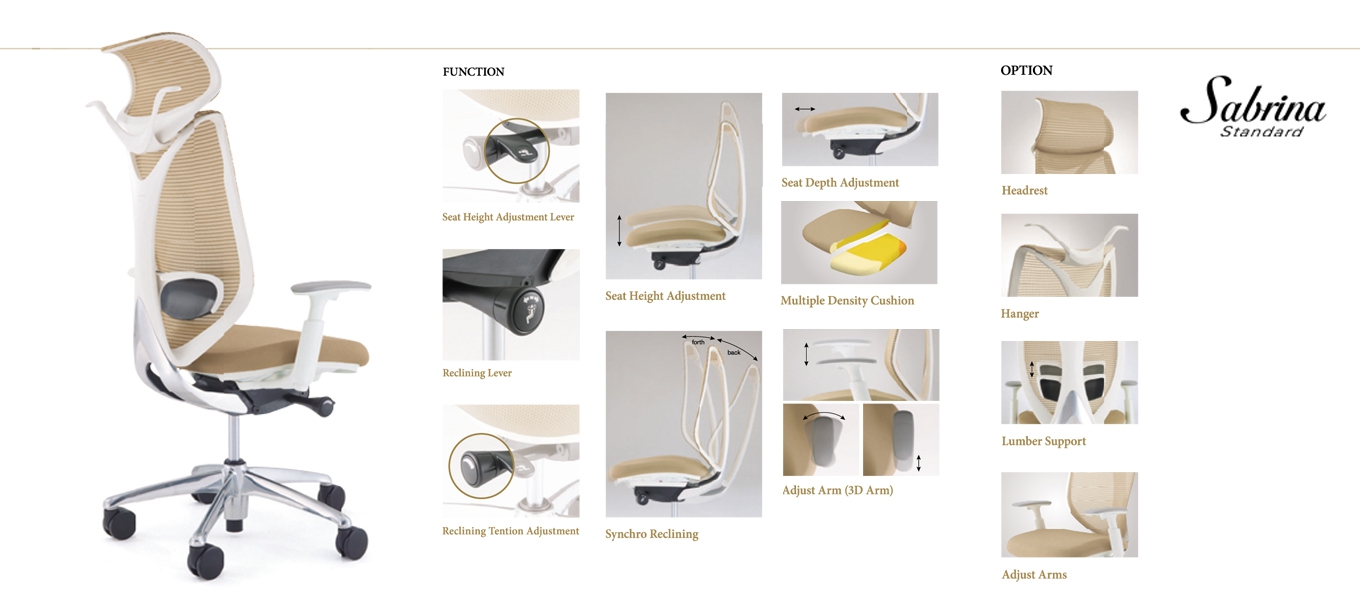 Correct posture supporting chair helps promote one's work, just as good-fitting clothes make one feel comfortable. The "Standart" has a "Synchro-Reclining" function enabling the chair backrest and seat to be synchronized by operating the lever located at the bottom of the seat. The functions include a foward-tilting seat.