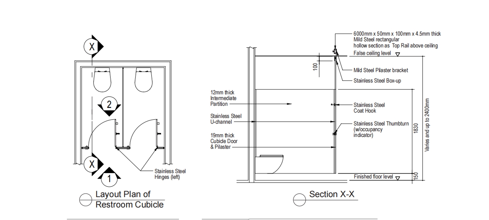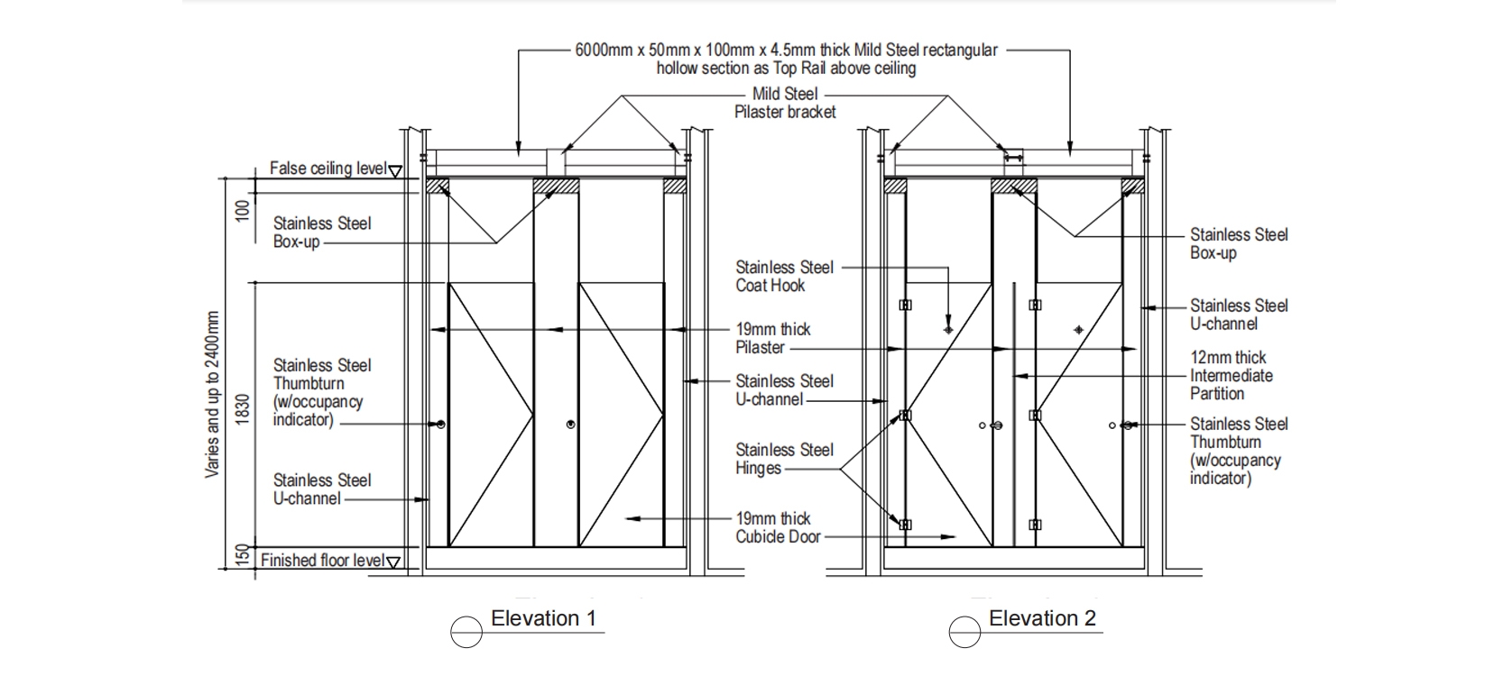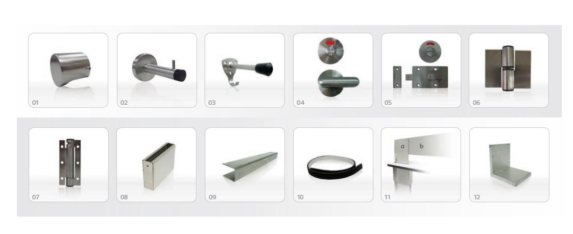 Doors All Doors shall be of 12mm thick HPL compact board with chamfered edge. Each will be supported by 3 Stainless Steel Hinges affixed to the pilaster, completed with Stainless Steel Coat Hook and Stainless Steel Door Knob.
